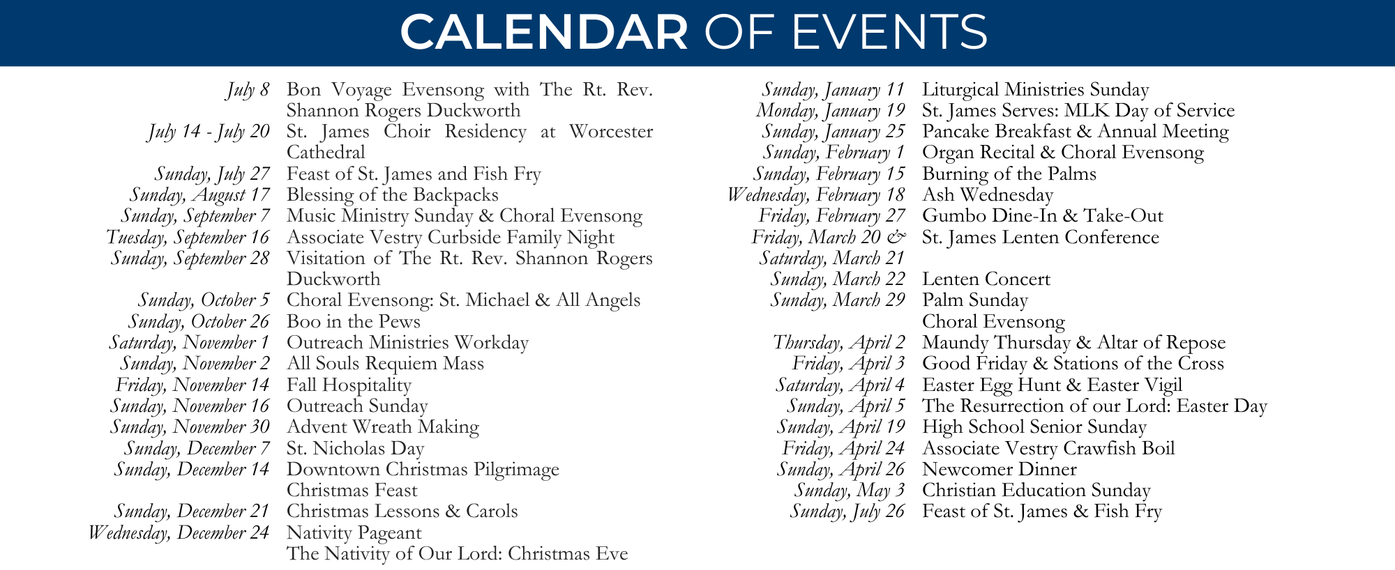 2025-2026 Upcoming Events Please note: events are subject to change in the interest of the health and safety of our St. James family. Stay up to date on programs and events through our website, weekly emails, and social media pages.